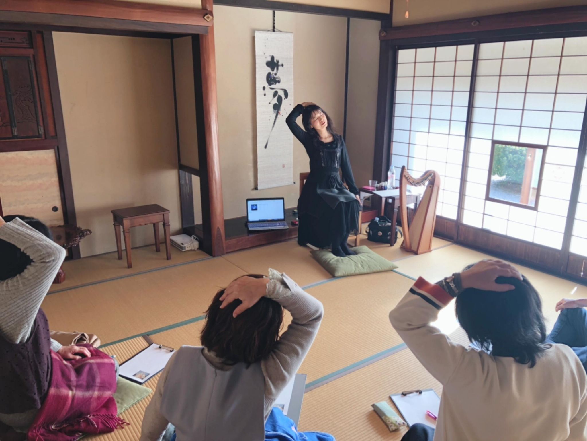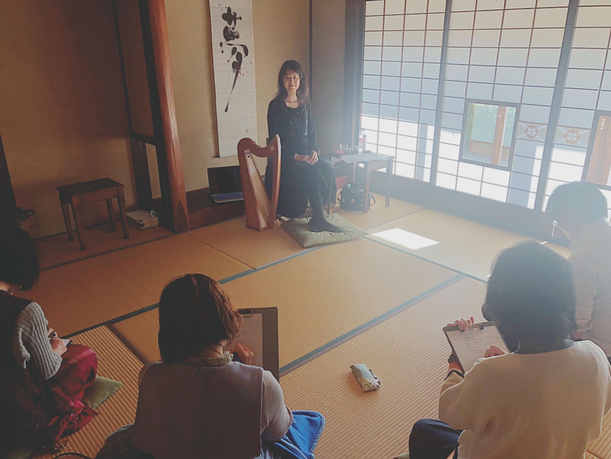 京都のサロンでも、プライベートの演奏会、アロマ&ケルティックハープの瞑想会、天使とケルティックハープのお茶会、ケルティックハープ教室を開催している。